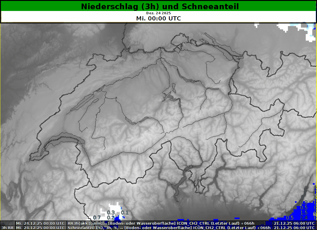Südlich der Alpen fällt über die Weihnachtstage verbreiteter und etwas mehr Niederschlag, besonders im westlichen Tessin und in der Simplonregion. Bei deutlich milderer Luft liegt die Schneefallgrenze um oder leicht über 1000 Meter.